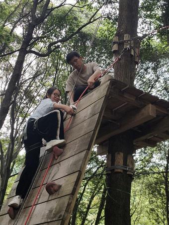 隊員們根據(jù)自己的體力挑選不同的線路,這項活動需要每個人獨立完成,活動現(xiàn)場不時能聽到尖叫、吶喊聲,還有隊員間相互的鼓勵和指導聲。整個運動中,也有隊員不慎滑落掛在半 空,隊員間的相互陪伴、安撫和鼓勵使得掛在半空也是另一種體驗,甚至覺得很享受。經(jīng)過一個小時左右時間,所有隊員都安全完成這項匯集高空、速度、力量、毅力的戶外探險活動。